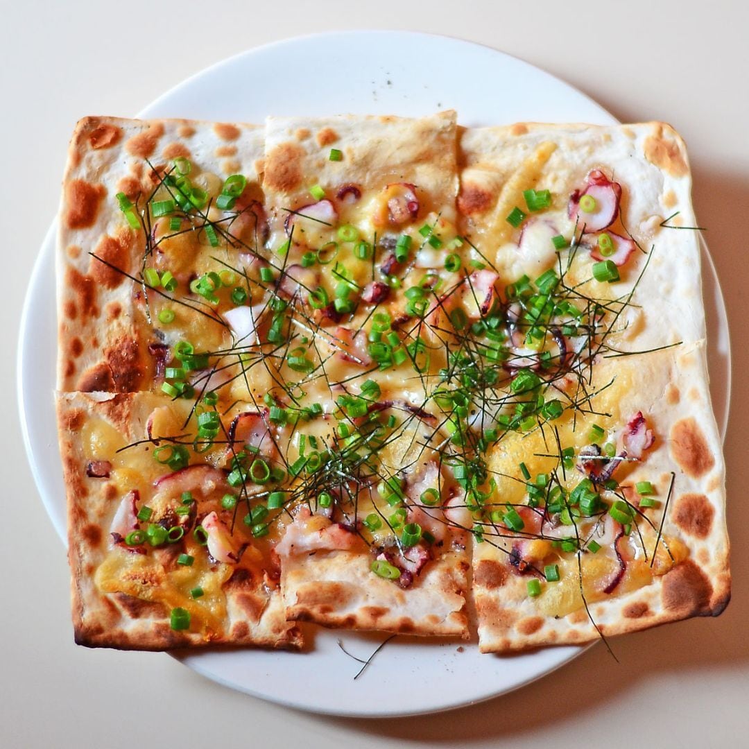 タコの食感とアンチョビの塩加減がちょうど良いのではないでしょうか。風味の良い細切りの海苔もトッピング。