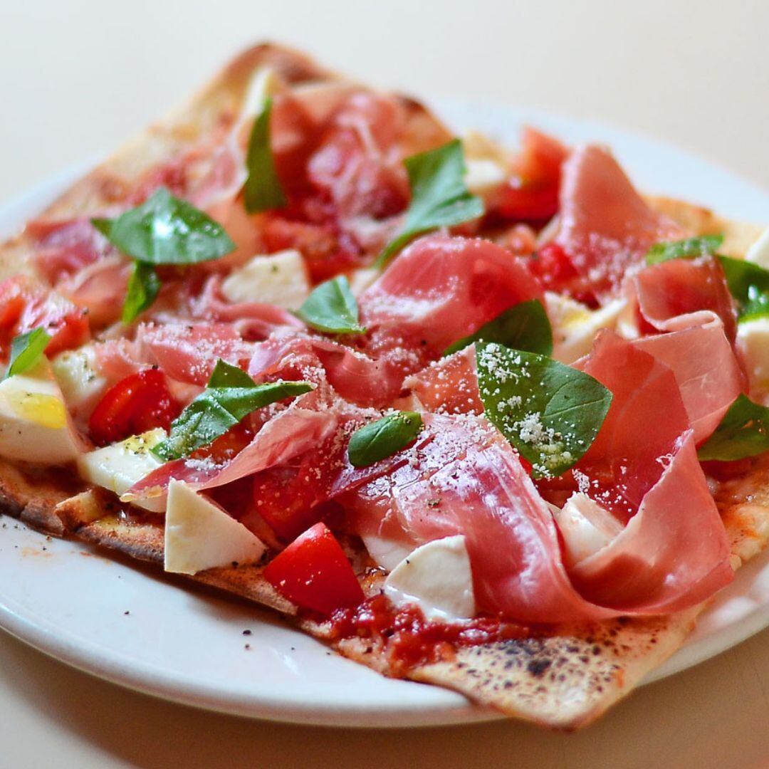 当店で一番売れているマルゲリータ・ピザをベースにフレッシュなモッツアレラや生トマト、スペイン産生ハム(ハモン・セラーノ)などをトッピング。