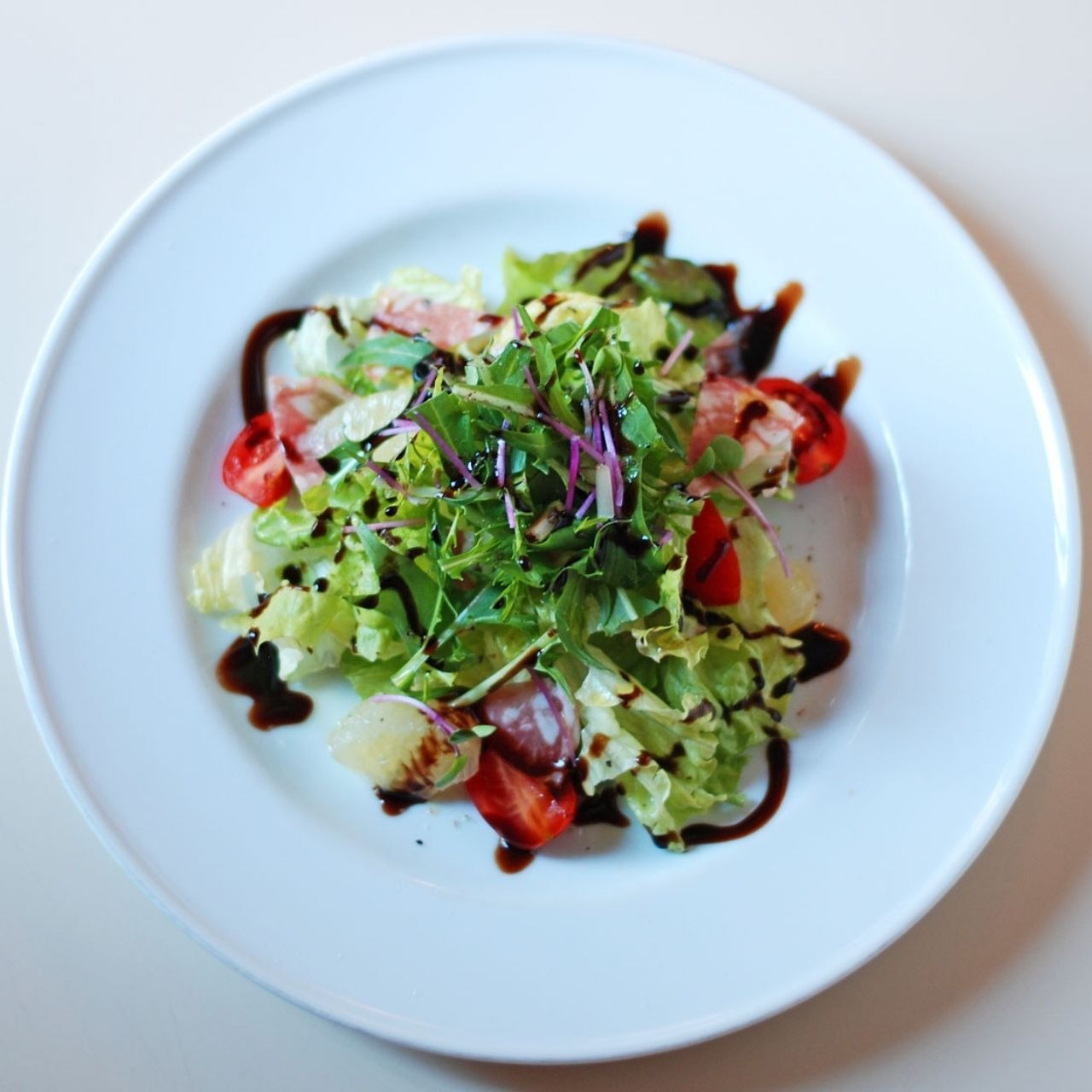 店主のひと言:サラダはもりもり食べて欲しいので、内容量を少し増やしました。また、バルサミコ酢系のソースでシンプルに味付け。飽きのこないように工夫いたしました。「とりあえず」、の一品としてご利用ください。(^^;